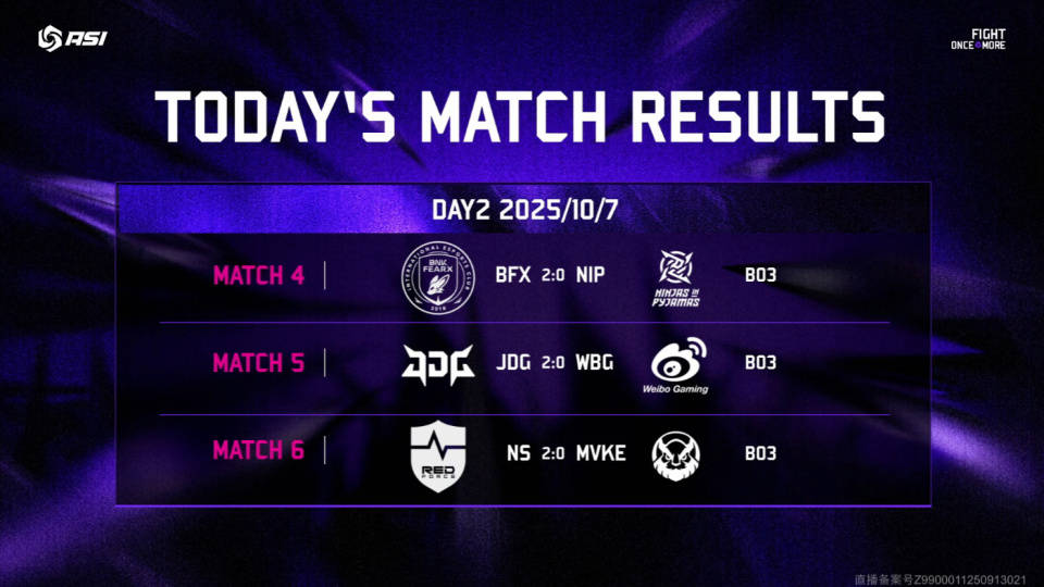 英雄联盟亚洲邀请赛,小组赛已经结束了,上一个比赛日,BFX横扫MVKE,拿下三连胜,成为小组赛唯一的全胜队伍,同时DK也在交手GAM时,以2:0的比分完成速通,拿到第三个淘汰赛名额,最后NS大战NIP,两队只打了两局,NS就赢下比赛,成功晋级淘汰赛,至此四强全部出炉。